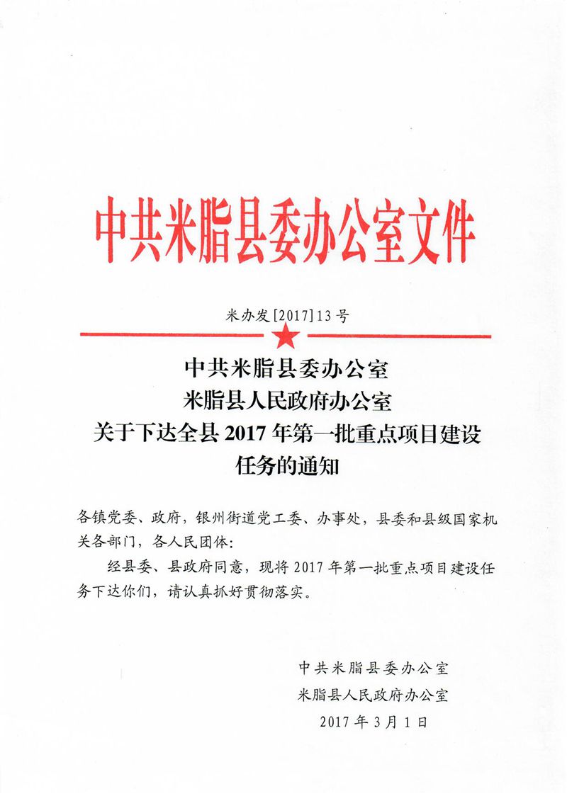 米脂县委办公室米脂县政府办公室关于下达全县2017年第一批重点项目建设任务通知