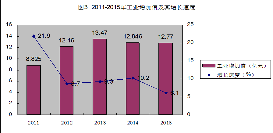 2015年全部工业增加值12.77亿元,同比增长6.1%。其中规模以上工业增加值10.88亿元,同比增长6.0%;规模以下工业增加值1.89亿元,同比增长6.5%。全县规模以上工业总产值30.5亿元,同比增长11.9%。