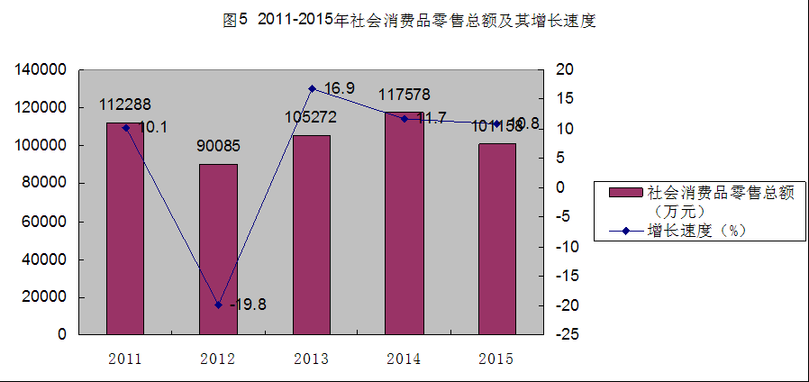 2015年全县社会消费品零售总额为101158万元,同比增长10.9%。其中限额以上完成19682万元,同比增长22.2%;限额以下完成71743万元,同比增长22.8%。分行业看,批发业销售额49170万元,比上年增长2.1%;零售业销售额173511万元,比上年增长8.4%;住宿业营业额3739万元,比上年增长5%;餐饮业营业额23597万元,比上年增长19.7%。