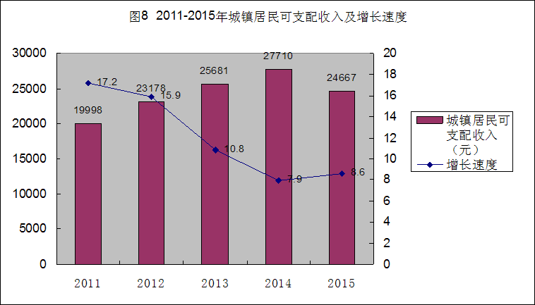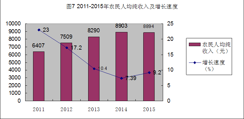 2015年,全县居民人均可支配收入达14507元,同比增长9.8%(新口径),其中全县农村居民人均可支配收入达8894元,同比增长9.2%(新口径);全县城镇居民人均可支配收入达24667元,同比增长8.6%(新口径)。