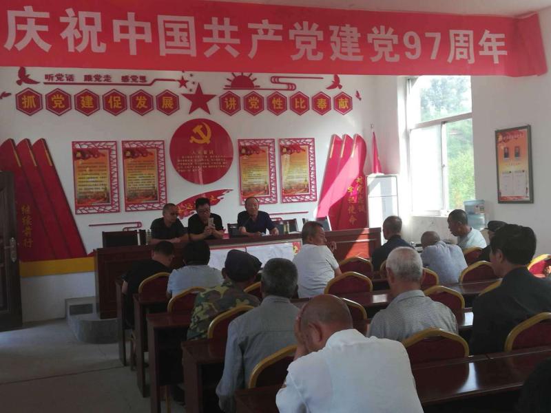 梁家沟村全体党员和群众欢聚一堂,共同庆祝伟大中国共产党建党97周年。村第一书记高东主持召开党员大会,开展“不忘初心跟党走,山沟沟里党旗红”主题教育活动,对全体党员进行了党课教育并发放了党徽和党章。