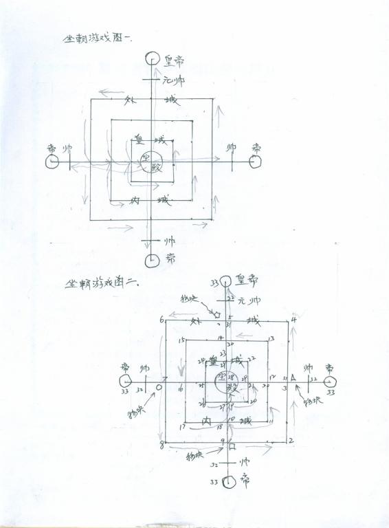 坐朝游戏的场地和材料并不讲究,图案却颇有韵味。如图所示(图1),由大小不同的三个正方形套在一块,在套起来的三个正方形中心点上画两条垂直交叉线辐射四面,突出来的部分等距离的画一小杠,线头画个圆圈。据说当时的李自成将这个图案外面的方形称为外城,里边第二个方形称作内城,最里边的叫皇城,中心十字交叉点上画一圆圈是宝殿,依次沿直线上升的交叉点是台阶,出了三个正方形后意味着登台就座,第一个点是兵马大元帅座,终端的圆圈便是皇帝宝座。